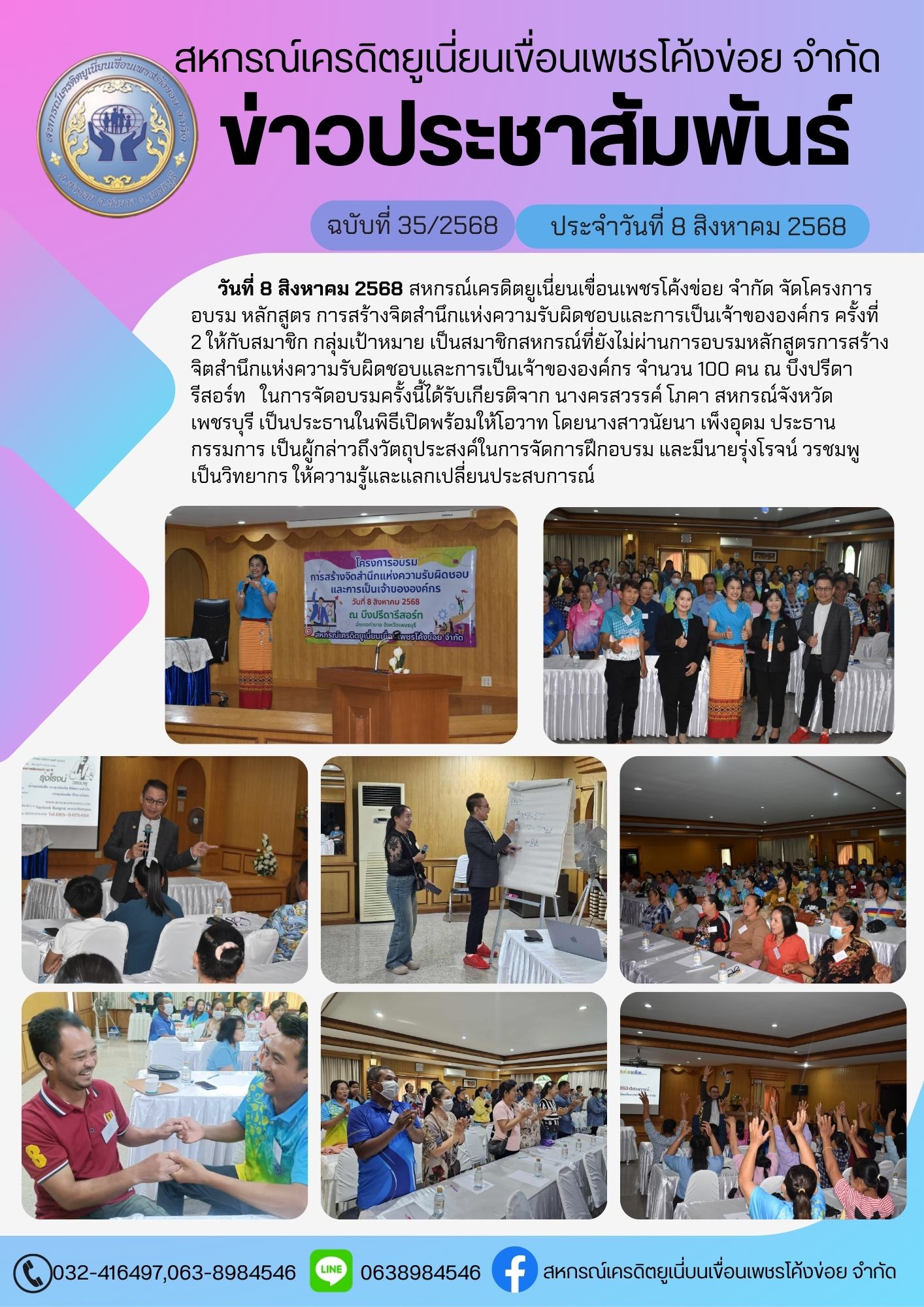 เรื่อง : วันที่ 8 สิงหาคม 2568 สหกรณ์เครดิตยูเนี่ยนเขื่อนเพชรโค้งข่อย จำกัด จัดโครงการอบรม หลักสูตร การสร้างจิตสำนึกแห่งความรับผิดชอบและการเป็นเจ้าขององค์กร ครั้งที่ 2